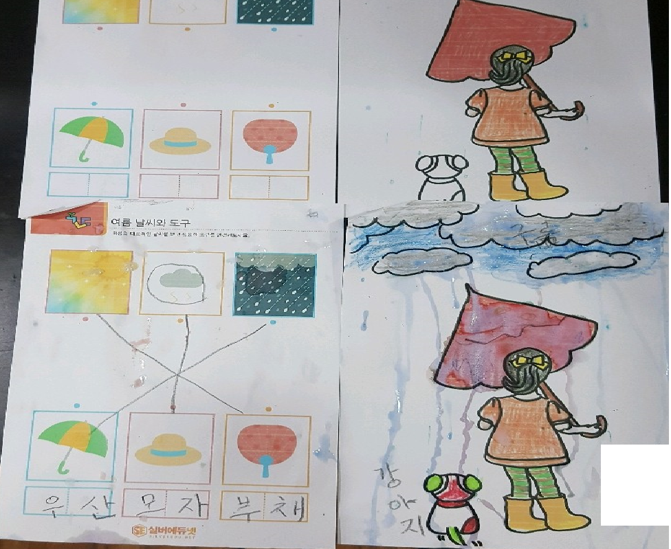 여름날씨관련 교육을 통하여 여름에 대한 이야기 및 주의사항을 나누며 사회적응을 돕고 활동자료를 통해 감각, 인지 및 신체적 자극을 도모한다.1. 여름날씨에 대한 설명을 실시함으로서 현재 계절감을 익힐수 있도록 한다.2. 여름 날씨, 주의점에 관한 이야기를 나눠보며 사회적응력을 높인다.3. 빗소리 청취를 통해 날씨에 대한 감각적인 느낌을 얻을 수 있다.4. 쓰기나,물감이나 색연필로 색칠하는 등의 다양한 소근육 활동을 함으로서 인지 자극에도움을 준다.