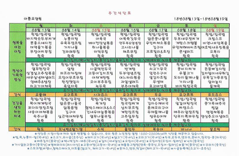 8월 3주차 식단표입니다.